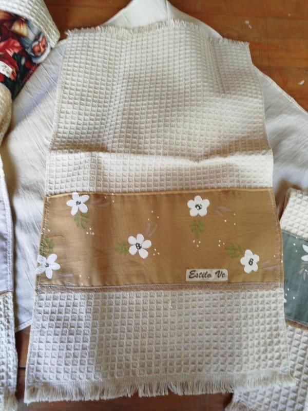 • Repasador Tela, panal de abeja, con aplique en tusor, pintado a mano 53 x 32 cm. con detalle mini puntilla de nylon a tono.